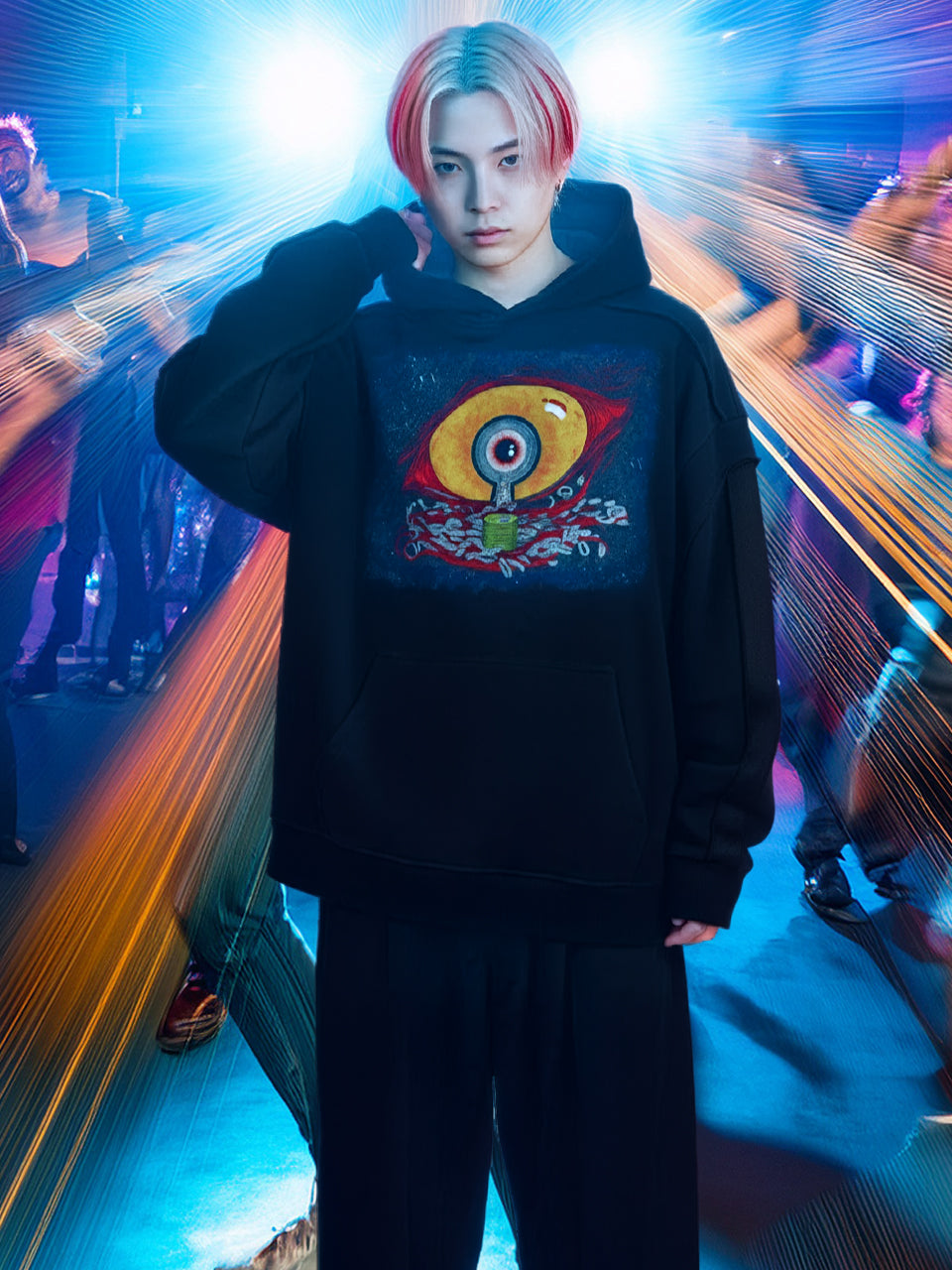Set on a contrast-tape, raw-edge, double-layered hoodie, the heavyweight build carries warmth and structure through winter. The oversized drape and print-ready panels ground the series, while three colorways—ash gray, onyx black, and bone—shift the mood: archival calm, high-contrast glow, and ritual warmth.