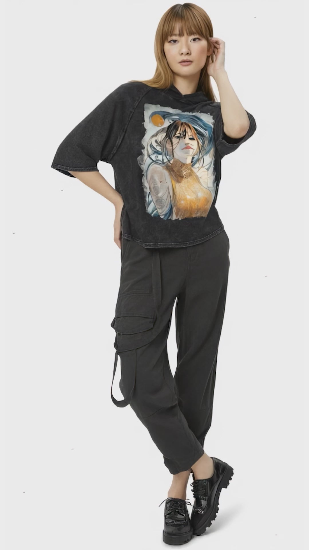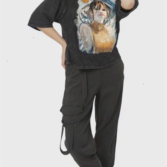 Inspired by the tranquil grace of the artwork Golden Weave, Maiden Calmness, this snow-washed hooded boxy t-shirt captures a sense of quiet confidence and luminous stillness. The piece centers on a serene figure whose golden garment glows like woven light, contrasted by flowing lines of deep blue energy that evoke calm motion and introspection. Rendered on pure cotton, the print’s fine textures and warm palette invite both reflection and everyday ease—making it a wearable expression of balance and gentle strength.